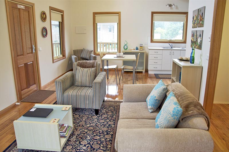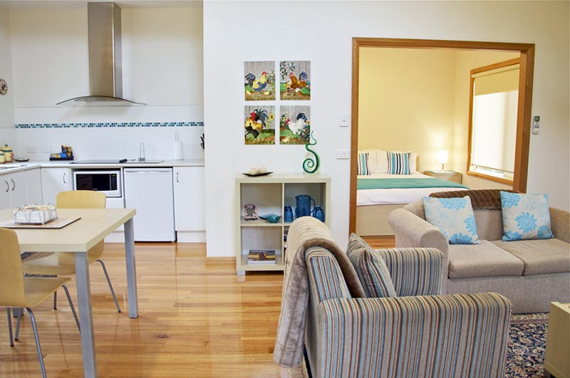 The lodge blends country charm with modern design and has one bedroom, open plan kitchen, dining and lounge and is fully self-contained.